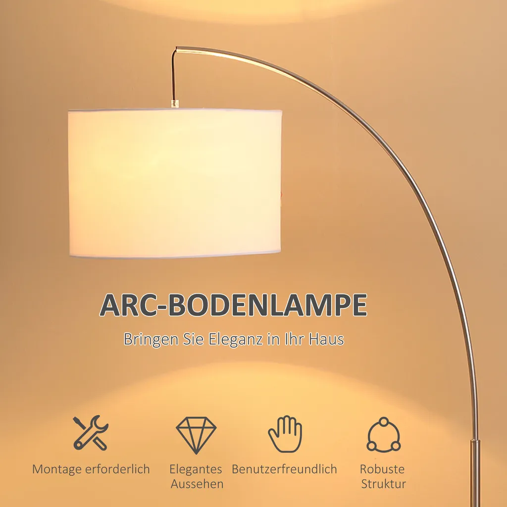 Mit einem bogenförmigen Ständer und einem zylindrischen Lampenschirm. Perfekt geeignet für Wohnzimmer, Schlafzimmer und Arbeitszimmer.