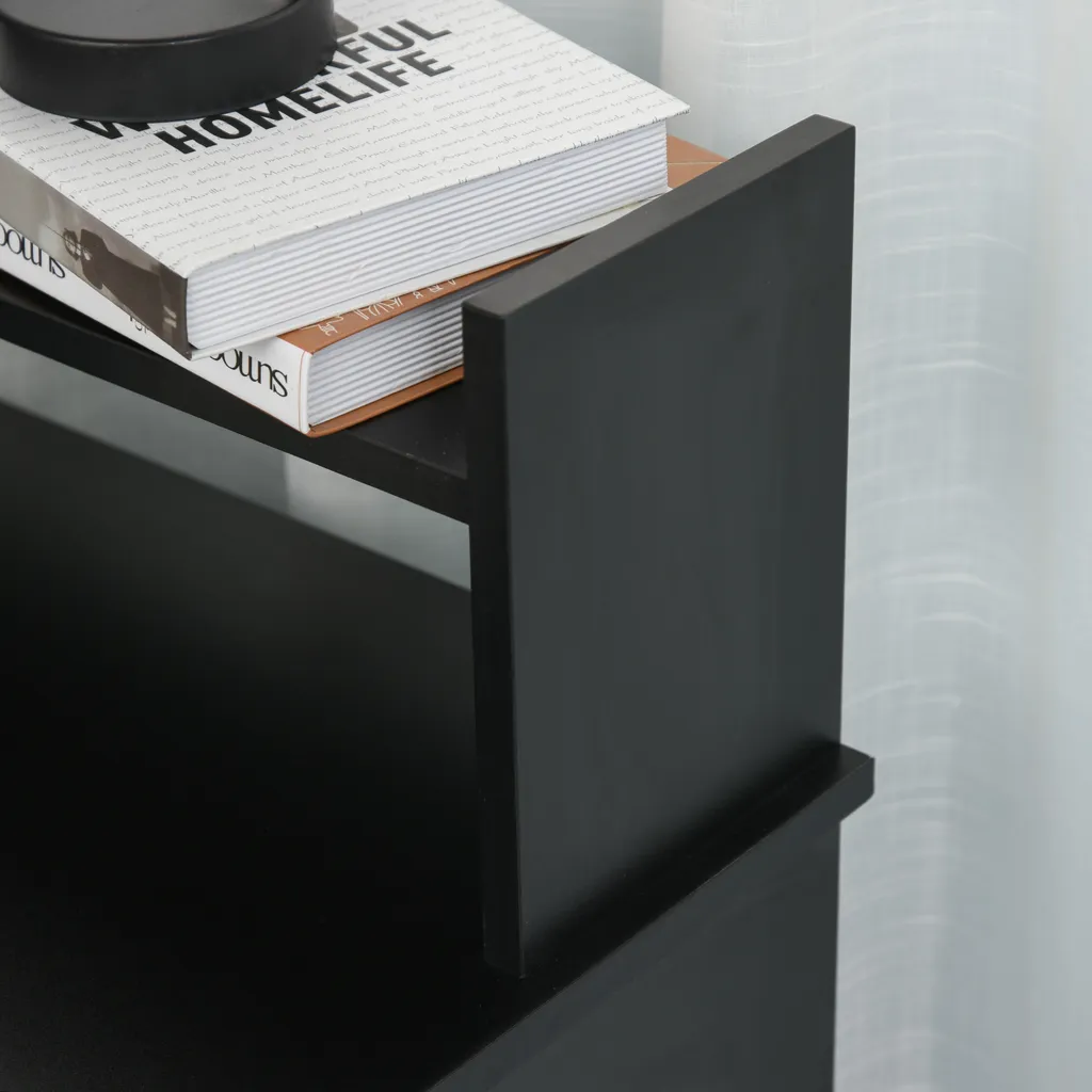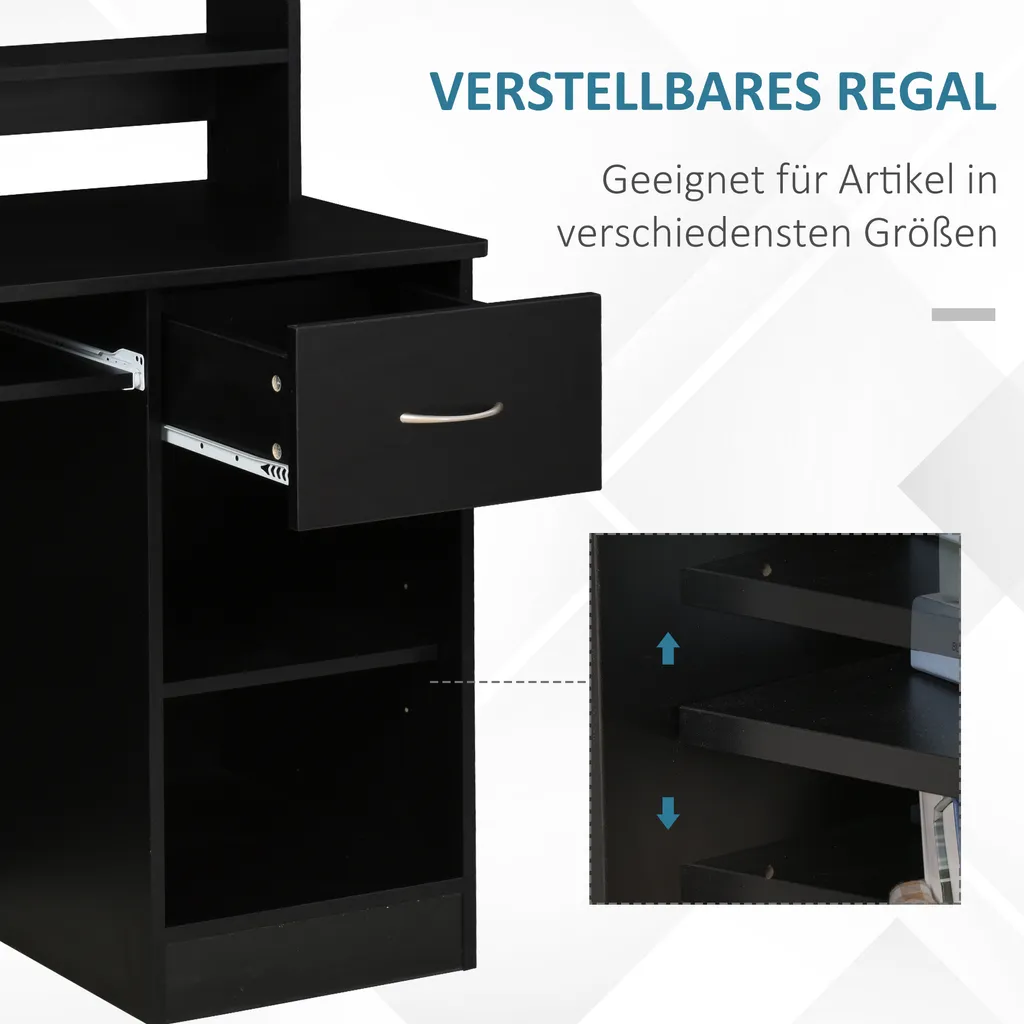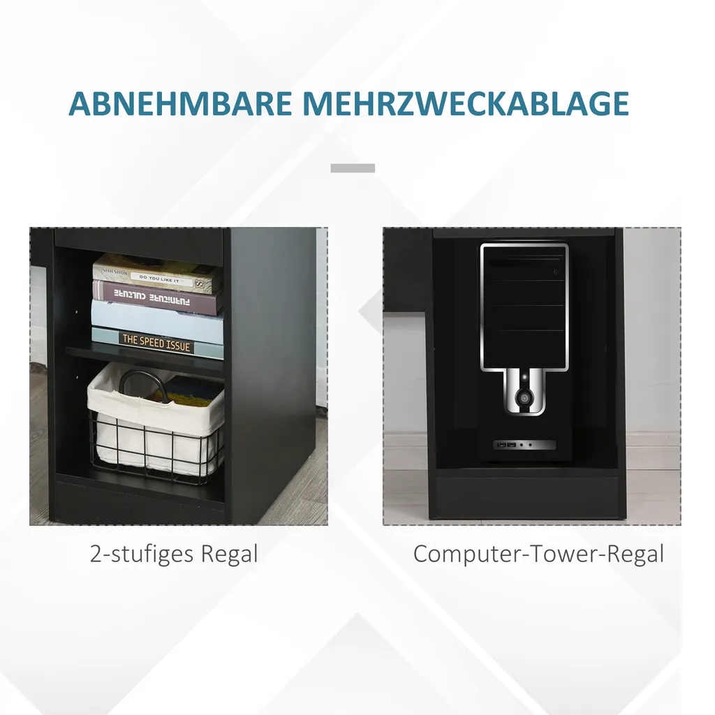 Eine ausziehbare Tastaturablage, eine Schublade für Zubehör und ein verstellbares Regal bieten viel Platz.