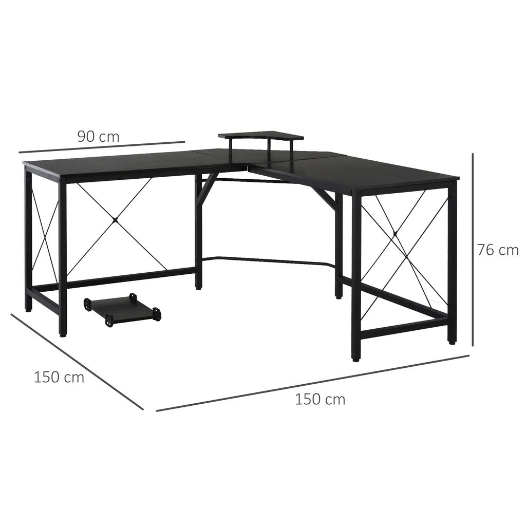 Maximale Belastbarkeit 70 kg. Gesamtmaße 150L x 150B x 76H cm, rechteckige Tischgröße 90B x 55T cm, Eck-Dreieck-Gestellgröße 60L x 60B cm