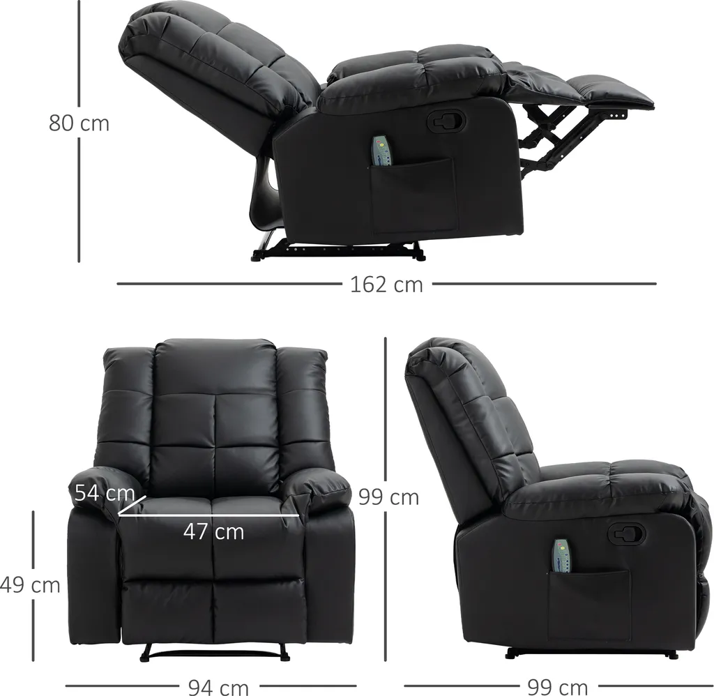 Gesamtmaße: 94L x 99B x 99H cm (aufrechte Rückenlehne), 162L x 94B x 80H cm (geneigte Rückenlehne), Belastbarkeit: 160 kg. Hinweis: Ältere Menschen sollten diesen Massagesessel in Anwesenheit von Familie und Freunden benutzen.