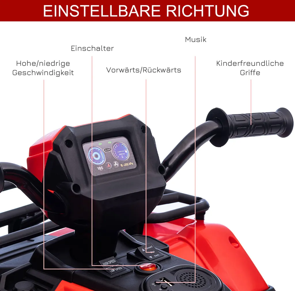 Lassen Sie Ihre Kleinen echte Offroad-Action mit unserem Kinder-Elektroquad von HOMCOM erleben! Mit 4 km/h Maximalgeschwindigkeit und hellen LED-Scheinwerfern, wird Ihr Kind in einen unvergesslichen Fahrspaß eintauchen. Robuste Materialien und ein schnittiges Racing-Design sehen nicht nur chic aus, sondern sorgen für eine besonders sichere Fahrt. Daneben verbessert das Quad die Feinmotorik und Koordination Ihres Kindes. Tun Sie Ihrem kleinen Fahrer eine Freude mit diesem unschlagbaren Geschenk!