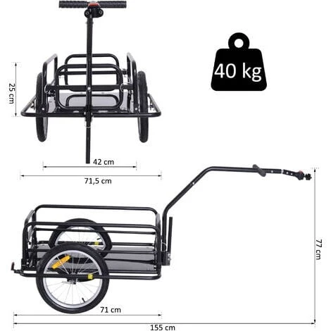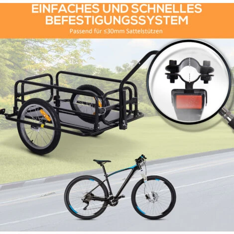 Mit dem Fahrrad lässt sich sehr wohl viel transportieren. Mit dem Lastenanhänger von HOMCOM sogar sehr einfach. Die Universal-Anhängerkupplung passt an fast jedes Fahrrad und ist schnell an- und wieder abmontiert. Der robuste Stahlrahmen lässt eine Beladung von bis zu 36 kg zu. Mit den 16-Zoll-Reifen ist sich der Anhänger auch vollbeladen noch leicht zu ziehen und die Felgenreflektoren sorgen für eine bessere Sichtbarkeit.