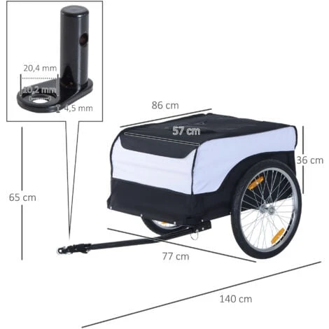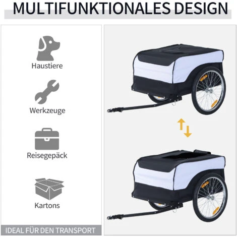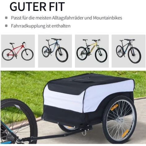 Mit dem Fahrrad lässt sich sehr wohl viel transportieren. Mit dem Lastenanhänger von HOMCOM sogar sehr einfach. Die Universal-Anhängerkupplung passt an fast jedes Fahrrad und ist schnell an- und wieder abmontiert. Der robuste Stahlrahmen lässt eine Beladung von bis zu 40 kg zu. Mit den 20-Zoll-Reifen ist sich der Anhänger auch vollbeladen noch leicht zu ziehen und die Felgenreflektoren sorgen für eine bessere Sichtbarkeit.