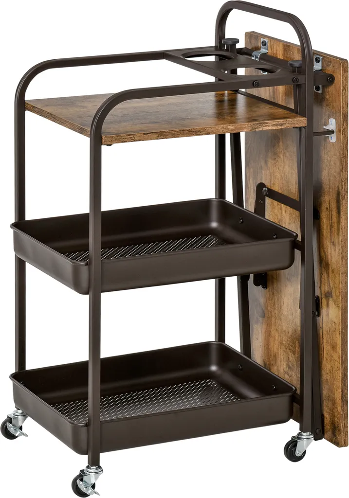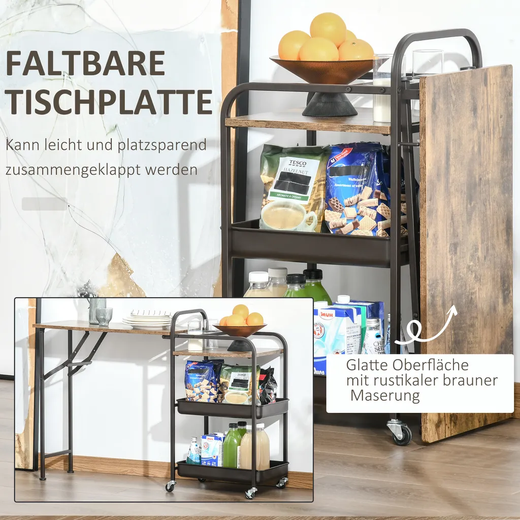 Dieser Küchenwagen kommt mit einer klappbaren Tischplatte, 2 Tablets und einem offenen Regal.