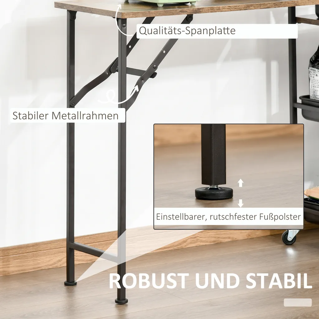 Durch seine vier Räder lässt sich der Küchenwagen leicht hin- und herbewegen. 2 Räder sind mit Bremsen ausgestattet, um ihn stabil an Ort und Stelle zu halten. Mit faltbarem Design und kompakter Größe ist das Wagen geeignet für den Einsatz in kleinen Räumen. Höhenverstellbare Fußpads gleichen unebenen Boden wieder aus.