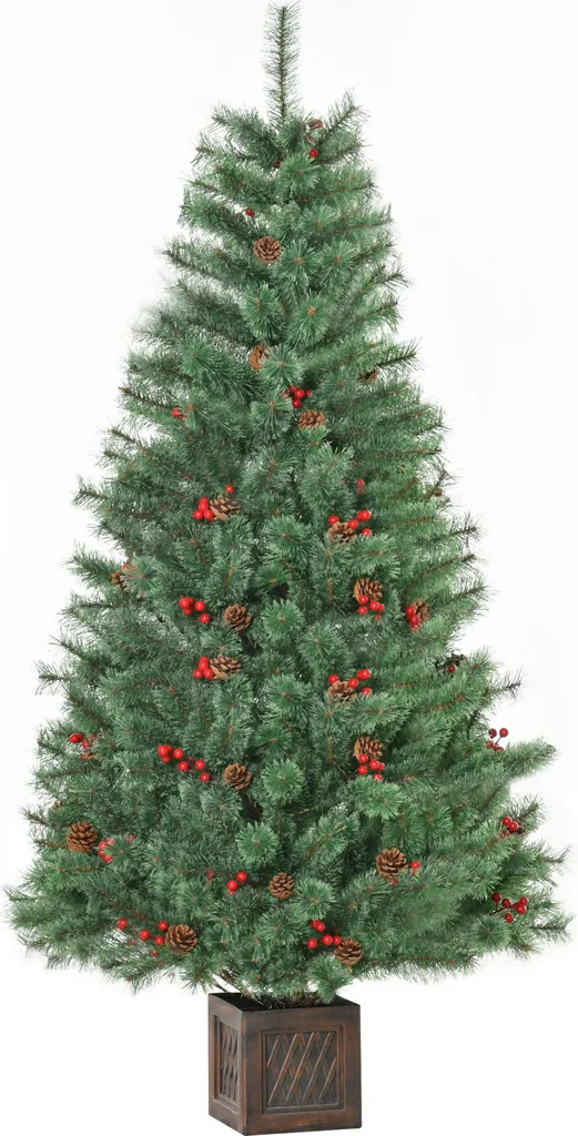 434 reichlich vorhandene Kunststoffzweigspitzen sorgen für eine vollmundige, dichte Tannenbaumform, die mit Tannenzapfen und roten Beeren zum Dekorieren versehen ist.