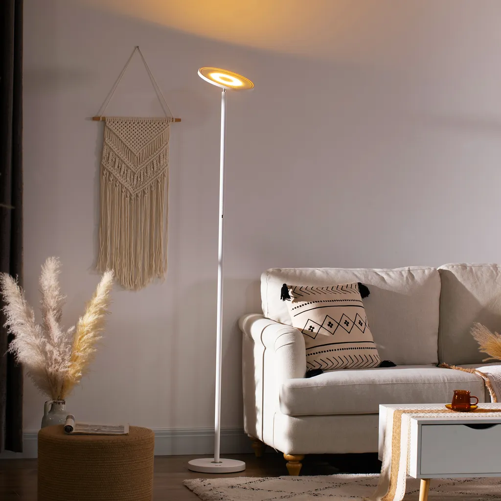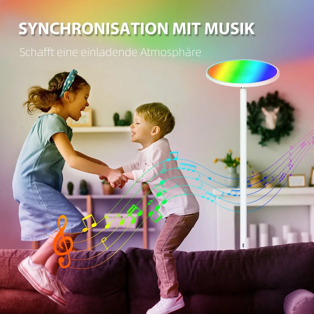 Der Deckenfluter gibt nach oben hin ein prächtiges, einstellbares Farbbouquet ab, während er nach unten mit angenehmem, weißem Licht (warmweiß, Tageslicht, kaltweiß) leuchtet. Die Helligkeit kann stufenlos von 10 % bis 100 % eingestellt werden. Der Kopf der Stehleuchte kann um 360° horizontal und um 30° nach oben und unten gedreht werden, sodass Sie sowohl indirekte Deckenbeleuchtung als auch dekorative, direkte Beleuchtung einstellen können.