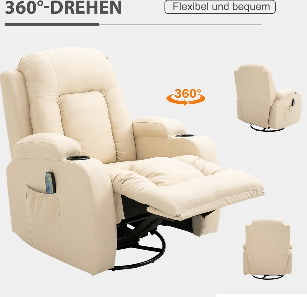 Dieser Massagesessel von HOMCOM wird durch seine großzügige Polsterung zum Wohlfühlsessel. Die Polsterung schmiegt sich dem Körper optimal an und ist zudem besonders langlebig. Das Obermaterial besteht aus hochwertigem Kunstleder, welches sehr pflegeleicht ist. Der besondere Clou- die Getränkehalter sind in den Armlehnen eingebaut. Für den ultimativen Entspannungsfaktor sorgt eine integrierte Wippfunktion.