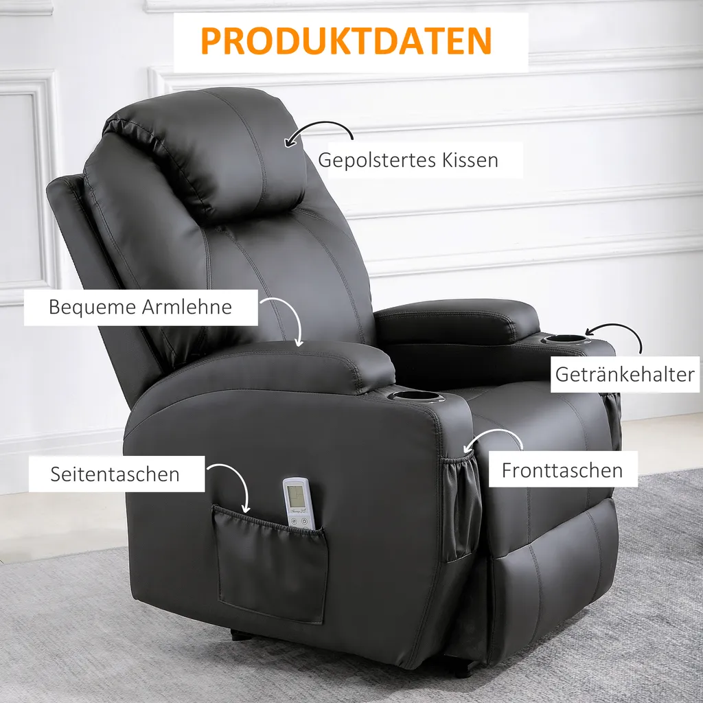 Der Relaxsessel mit Massagefunktion verfügt über eine strapazierfähige Oberfläche, die sich für eine intensive Nutzung eignet und leicht zu pflegen ist. Komfortable Kopf- und Lendenwirbelstütze, gebogene Armlehnen und weich polsterte Liegekissen sind alle auf einem stabilen Holz/Metall-Rahmen aufgebaut und bieten lang anhaltenden Komfort.