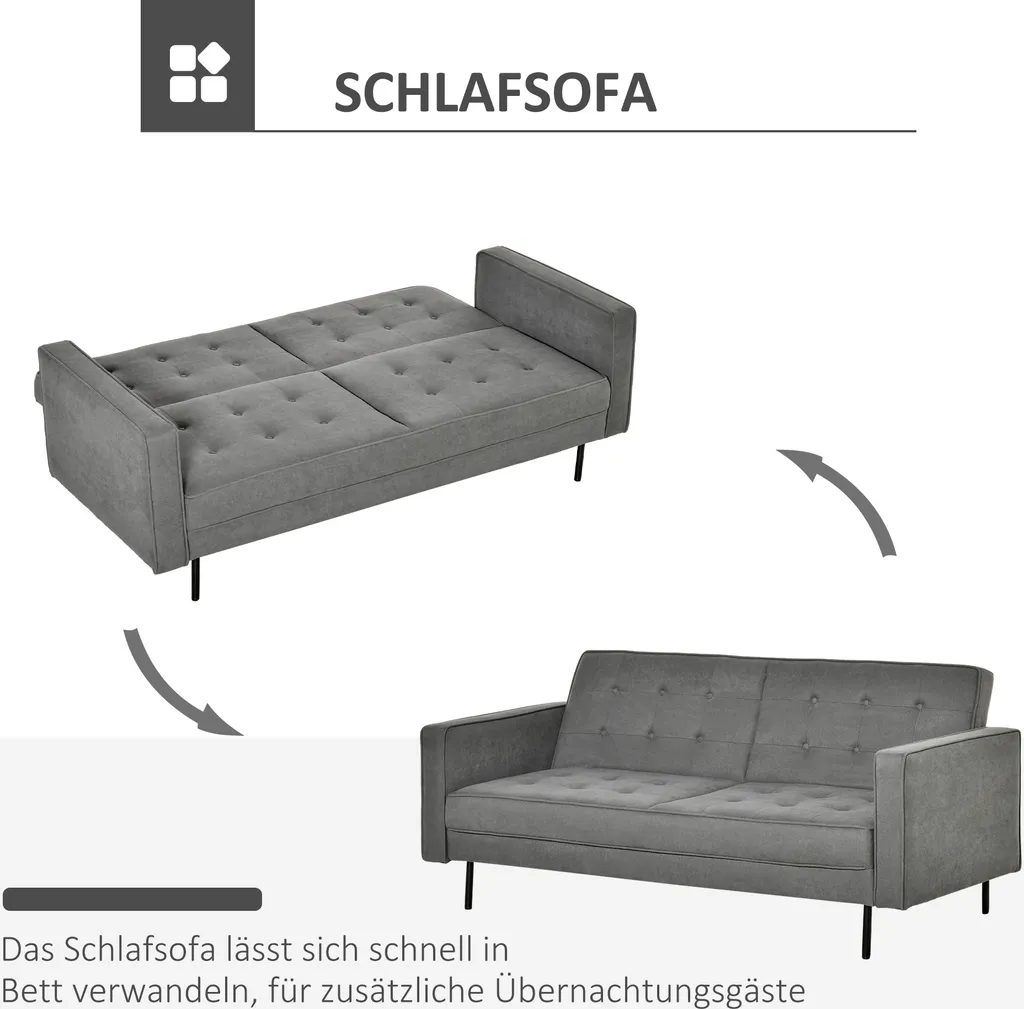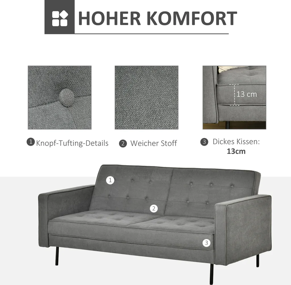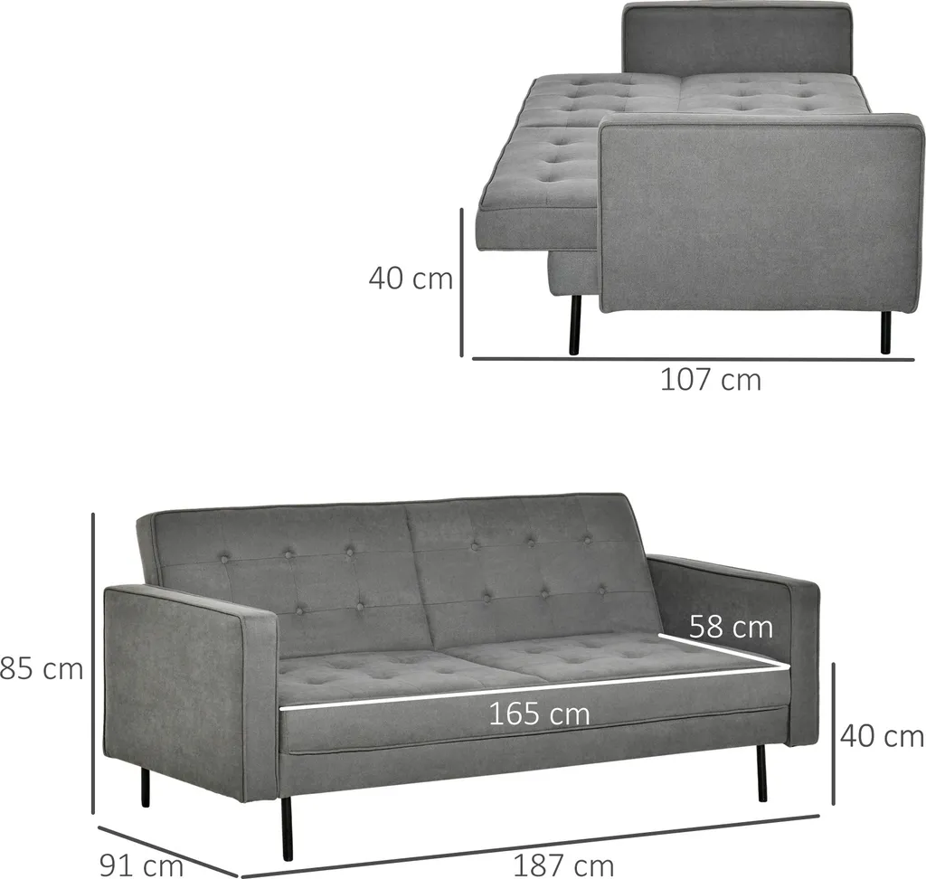 187B x 91T x 85H cm (Sofa), 165B x 107T x 40H cm (Bett). Belastbarkeit: 100 kg (pro Sitz).
