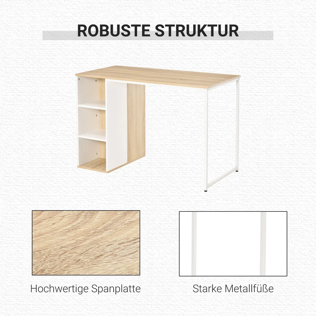 Der aus hochwertigen Spanplatten und pulverbeschichtetem Metallgestell bestehender Schreibtisch ist stabil und langlebig. Rutschfeste Fußpolster unter den Metallfüßen schützen den Boden vor Kratzern