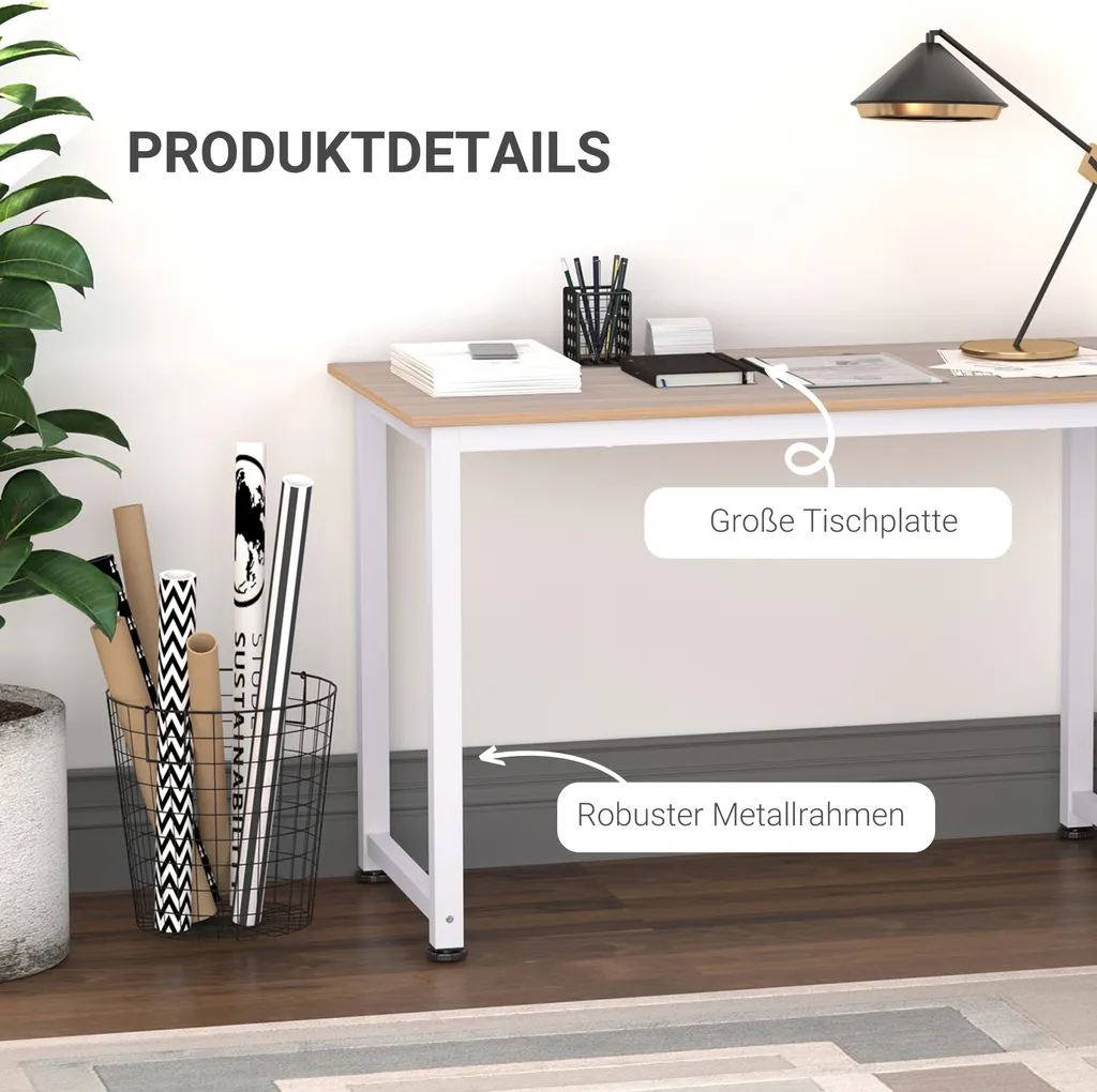 Mit seinem Metallgestell samt Querstreben und der wasserabweisenden Tischplatte aus melaminiertem MDF ist dieser Schreibtisch pflegeleicht und stabil mit einer Belastbarkeit von stolzen 100 kg.
