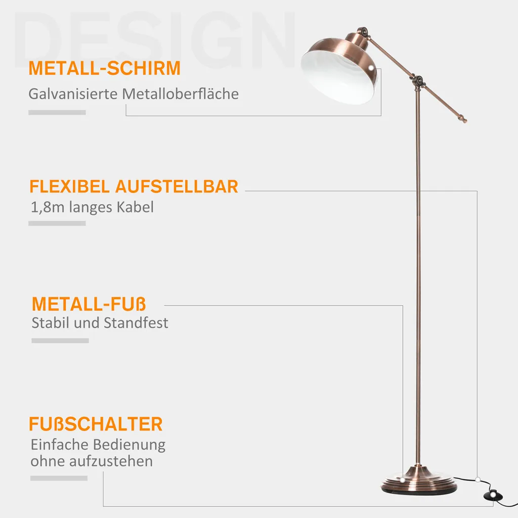 Hält eine einzelne E27 Lampenfassung für eine 40W-Lampe (nicht im Lieferumfang enthalten) und verwendet einen einfachen Fußschalter. Ausgestattet mit einem 1,8 m langen Netzkabel für bequemen Zugang zum Stecker.