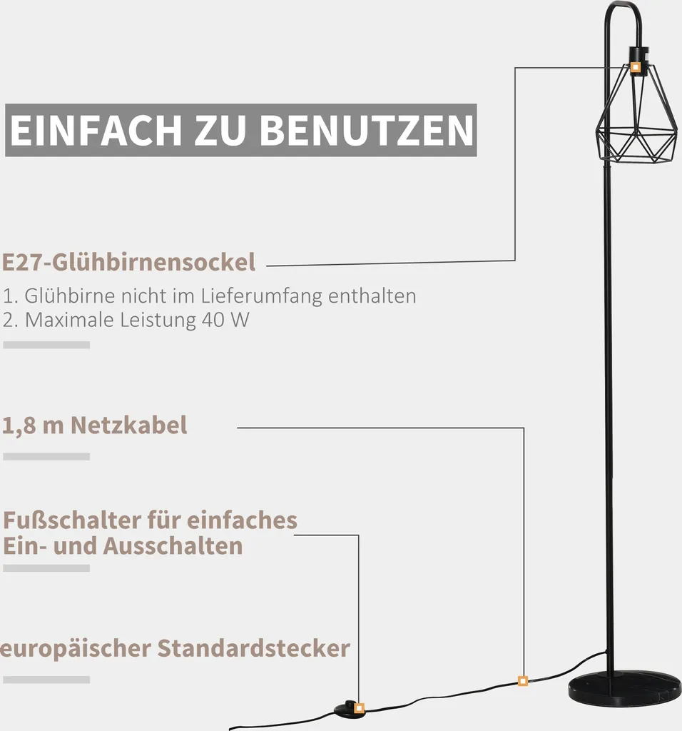 Zur Ausstattung gehören ein Fußschalter und ein 1,8 langes Netzkabel; Die Lampe ist für Leuchtmittel E27 (40W) geeignet. Die Leuchtmittel sind nicht im Lieferumfang enthalten.