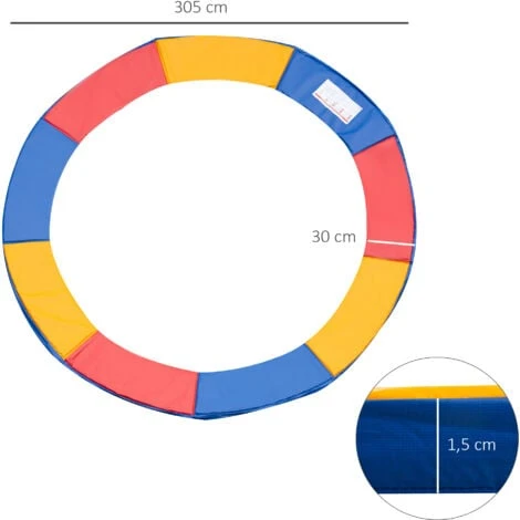 Sicher, langlebig und leicht anzubringen. Unsere rot-gelb-blaue Outsunny Randabdeckung eignet sich, herstellerunabhängig, für gängige Trampoline mit einem Durchmesser von Ø305 cm. Die 15mm dicke EPE-Polsterung überdeckt die Spiralfedern sicher und schützt Ihre Kinder vor Verletzungen. Mittels der haltbaren Schlaufen wird sie unkompliziert am Rahmengestell Ihres Trampolins angebracht. Der bunte PVC-Überzug ist unempfindlich gegenüber Wettereinflüssen und Sonnenlicht, haltbar und lässt sich zudem kinderleicht reinigen. So ersetzen Sie Ihre alte Randabdeckung unkompliziert. HINWEIS: Bitte vermessen Sie Ihr Trampolin sowie die Länge der Spiralfedern im Vorfeld, um eine Fehlbestellung zu vermeiden. Bei langen Spiralfedern benötigen Sie ggf. eine breitere Abdeckung.