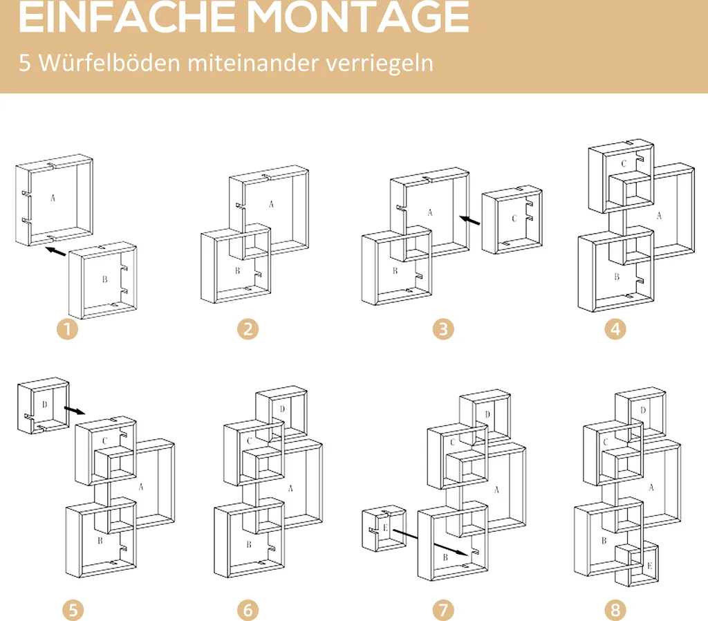 Gesamtmaße: 49,5L x 10,2B x 86H cm. Tragkraft: 10 kg (insgesamt), 2,5 kg (jeder Würfel). Montage erforderlich.